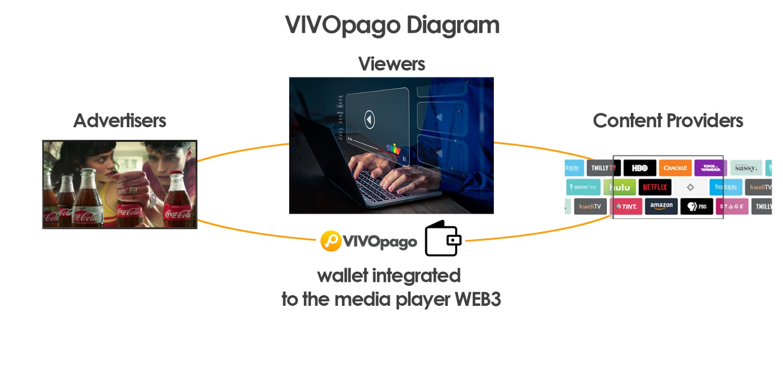 The premium content business does not use advertising based revenue models to monetize its assets. This is why we created VIVOpago, a three-way smart contract between advertisers, premium content distributors and viewers, all in one Dapp: